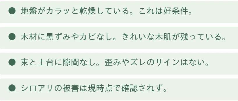 【補足】実はこの物件、過去にシロアリの被害があったことが分かりました。ただし、3年前に専門業者が薬剤処理済みで、保証期間がまだ約2年残っています。現時点では新しい被害の兆候はありませんでした。保証が切れる前に再処理を検討するのがおすすめです。