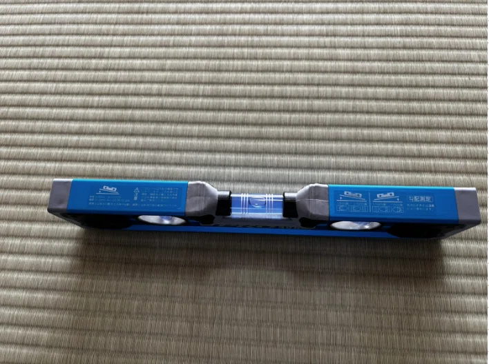 床の傾きって、意外と気づきにくいんです。とくに住んでいると、ほとんど気がつきません。傾きがあるとドアの開閉が悪くなったり、ビー玉が転がったり(笑)、体調に影響が出ることもあります。国土交通省の指針では、1メートルあたり6mm以内が許容範囲。私は各部屋に水平器を置いて、一つひとつ確認していきました。