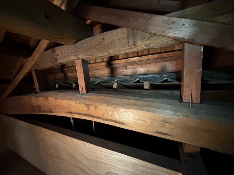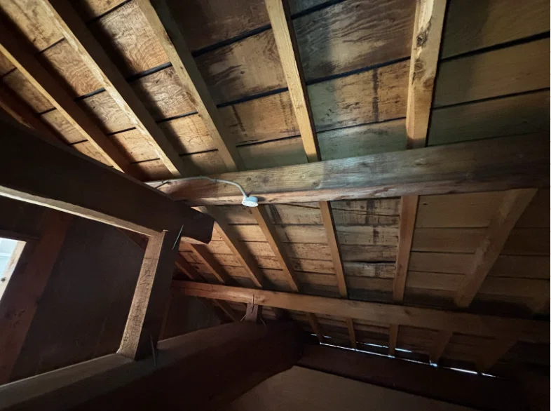 床下の次は、反対側の「屋根裏」です。ここでは主に雨漏りの痕跡を探します。過去に一度でも雨漏りがあれば、野地板(屋根の裏側の板)にシミが残っているものです。