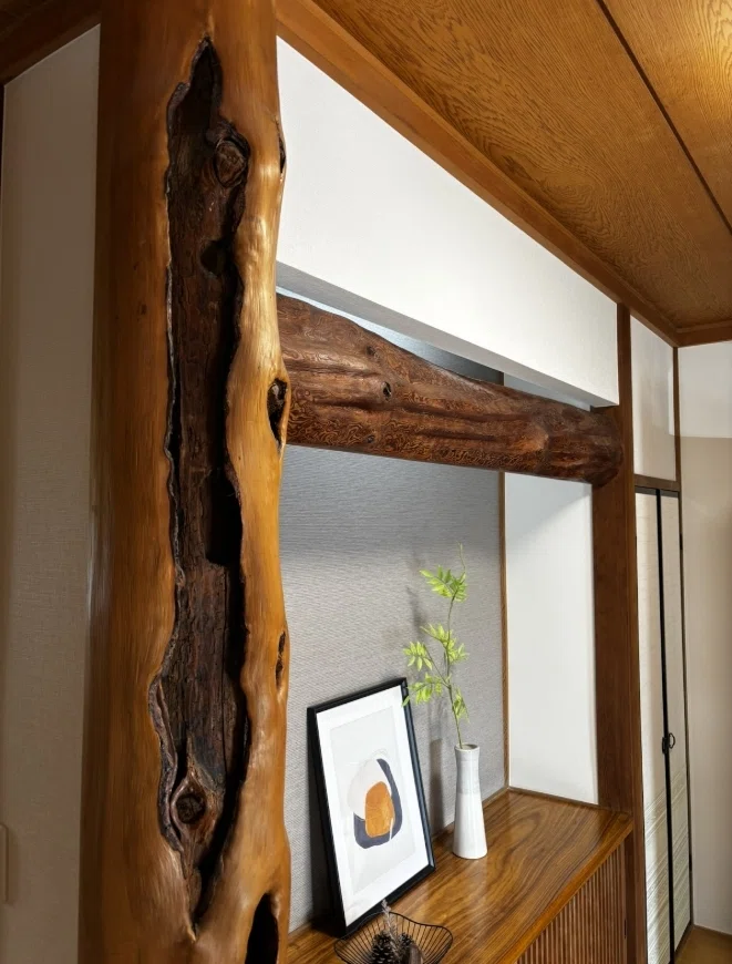 ちなみに、この家に入って最初に目を引いたのがこれ。玄関正面の飾り棚に、天然木の一枚板が柱と梁に使われています。