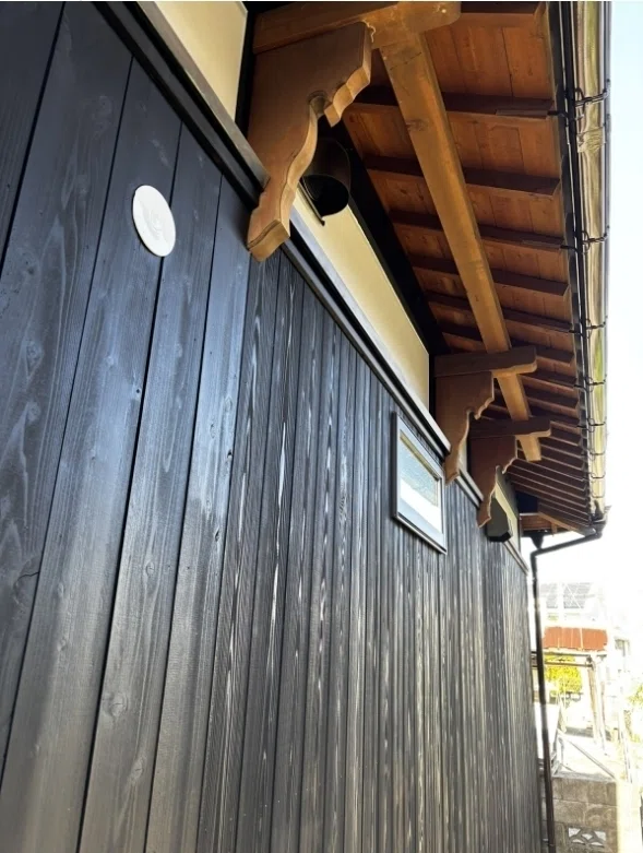外壁と軒天。焼き杉の外壁がいい味を出している。