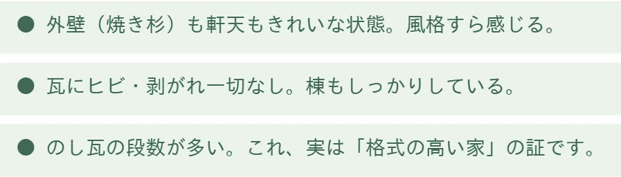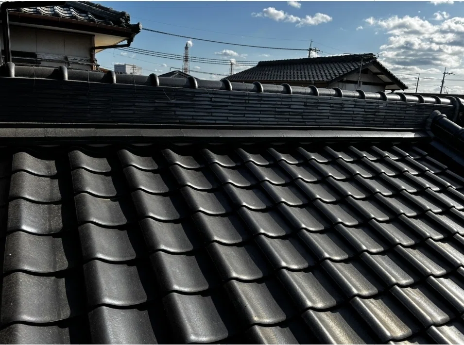 瓦屋根。ヒビも剥がれもなく艶がある。棟瓦も豪華。